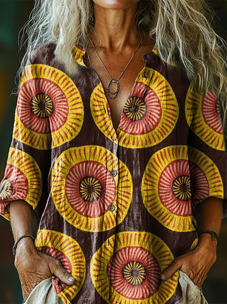 Women's Vintage Folk Floral Art Print Casual Cotton Linen Shirt