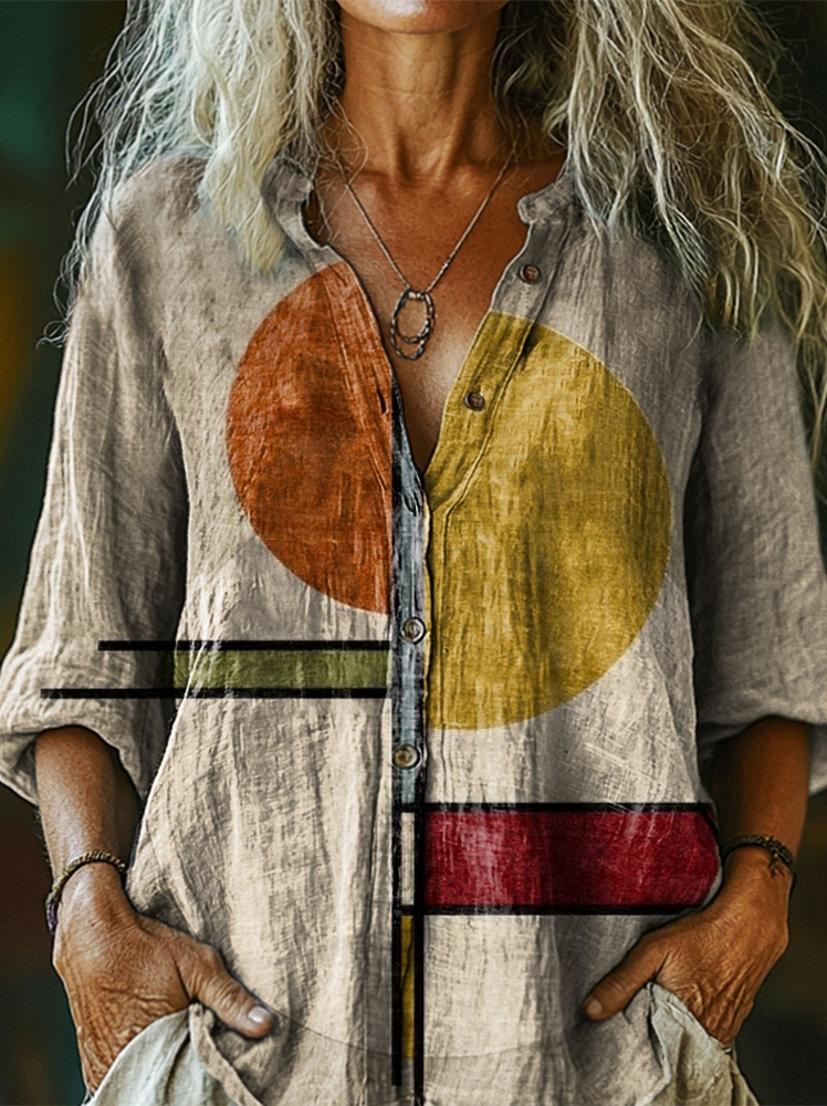 Women's Vintage Geometric Art Print Casual Cotton Linen Shirt
