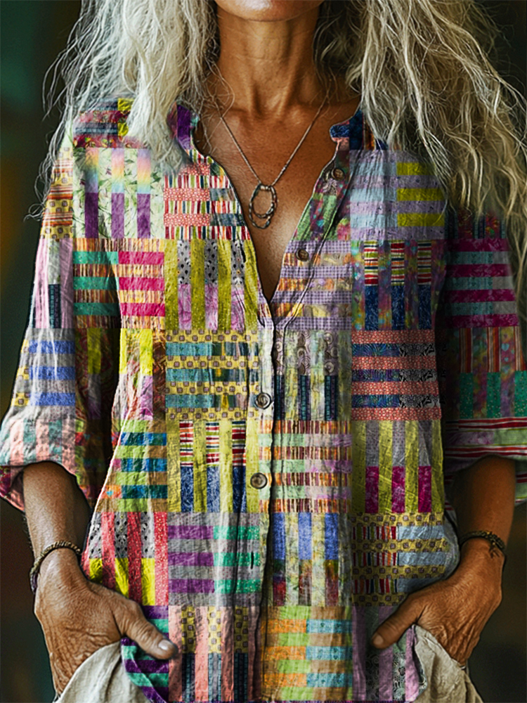 Women's Vintage Geometry Art Print Casual Cotton Linen Shirt