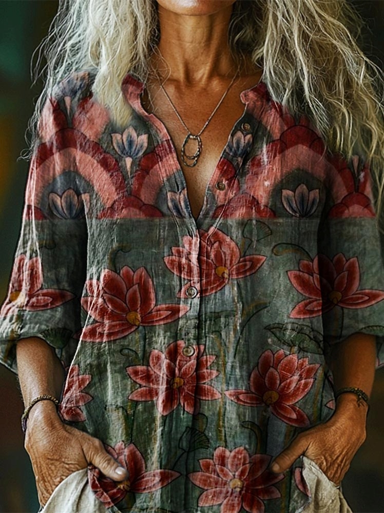 Women's Vintage Lotus Flower Collage Print Casual Cotton Linen Shirt