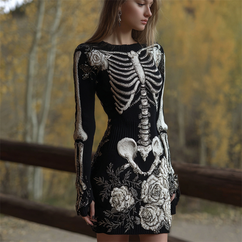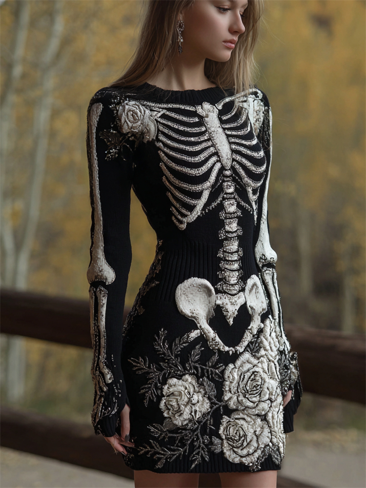 Classy White Roses Skeleton Glitter Beaded Cozy Knit Sweater Dress