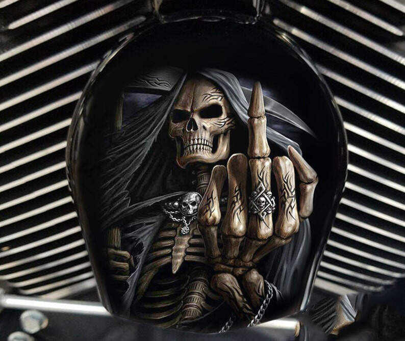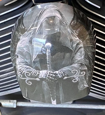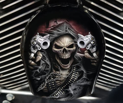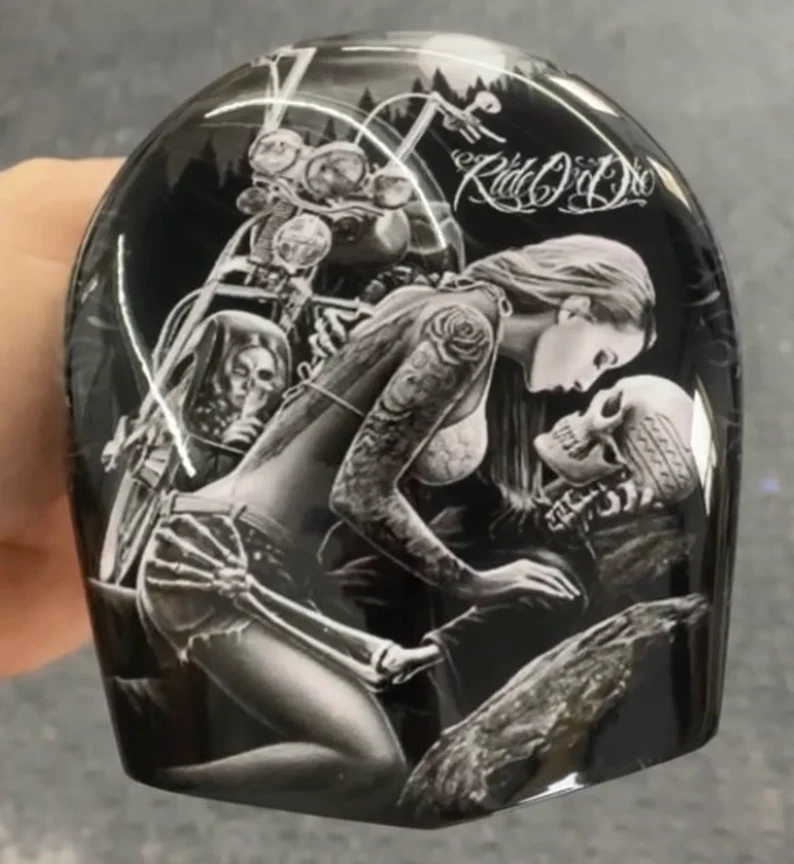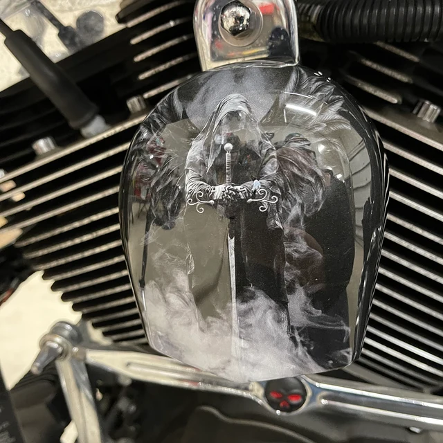 Replace your stock factory cowbell or waterfall style horn with this custom handmade piece, utilizing your existing hardware. The design is hardcoated onto the OEM horn cover, with the design fading to black on the sides to compliment the engine.