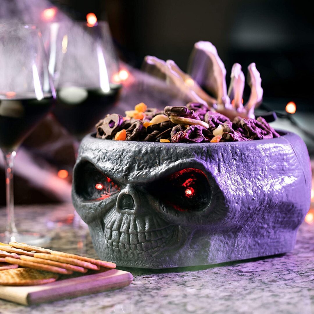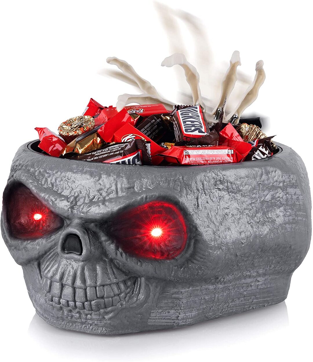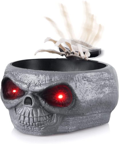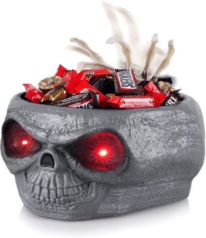 The back of the bowl houses a ghost white skeleton hand in a hidden compartment that jumps out when a hand reaching for tasty treats triggers the motion activated sensor.