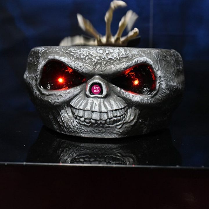Additional Special Effects - As the skeleton hand emerges from the bowl, the skull's eyes illuminate and flash ruby red while the haunting noise of a monster's roar rises and shrieks into the night