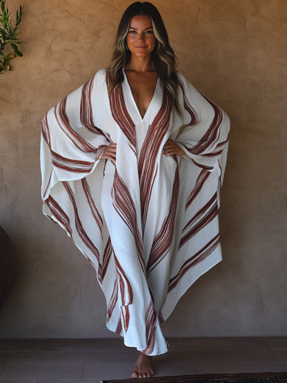 Ladies' Brushstroke Symphony Art Red-White Linen V-Neck Robe