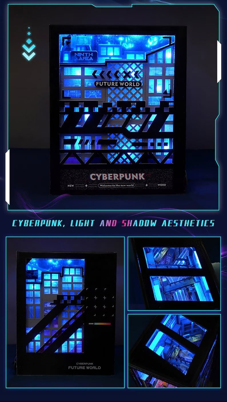 Cyberpunk aesthetics on the bookshelf, illusionary mirrored curtain wall, unique aesthetics of cyberpunk, extended gray streets in mirrors, fusion of cover blue light tall buildings.