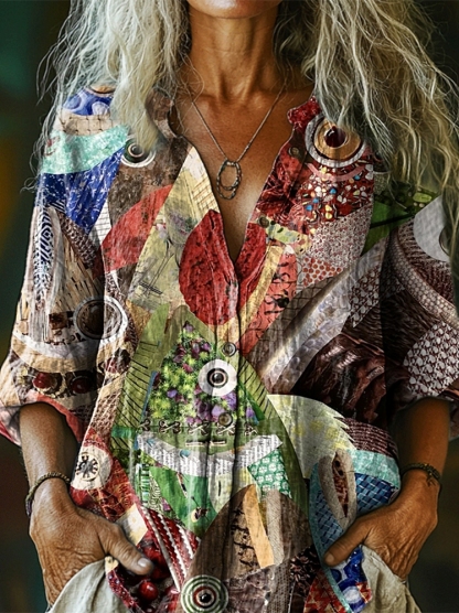 Women's Ethnic Fish Collage Art Print Casual Cotton Linen Shirt