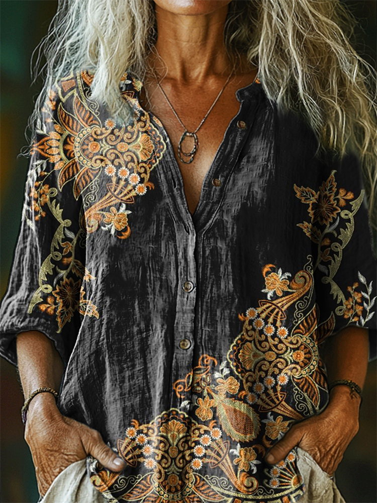Women's Floral Tattoo Pattern Art Print Casual Cotton Linen Shirt