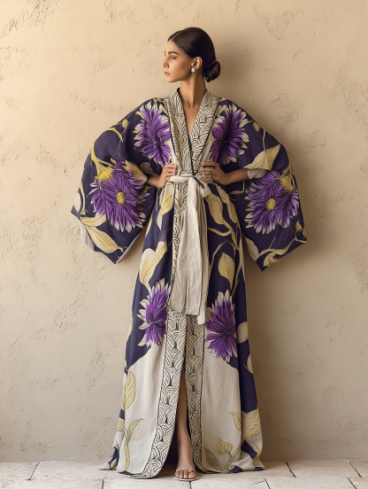 Chic design: The bright purple sunflower on a deep purple background features traditional kimono-style sleeves and an elegant silhouette with a belt for a flattering fit.