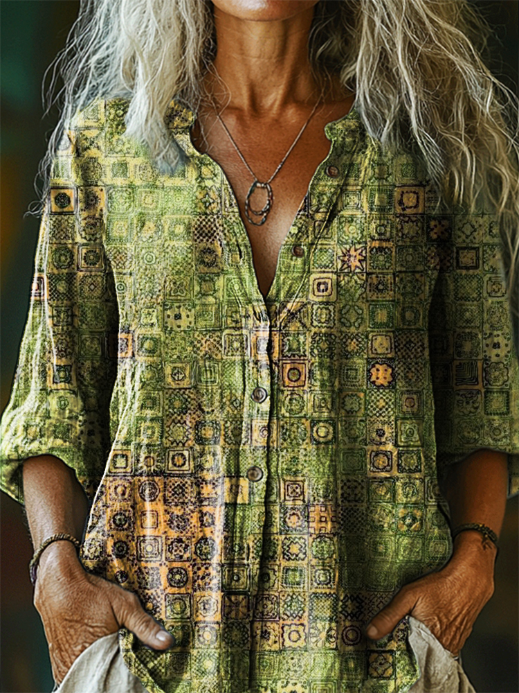 Women's Vintage Bohemian Floral Art Print Casual Cotton Linen Shirt