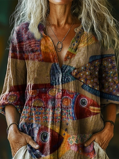 Women's Vintage Ethnic Fish Art Print Casual Cotton Linen Shirt