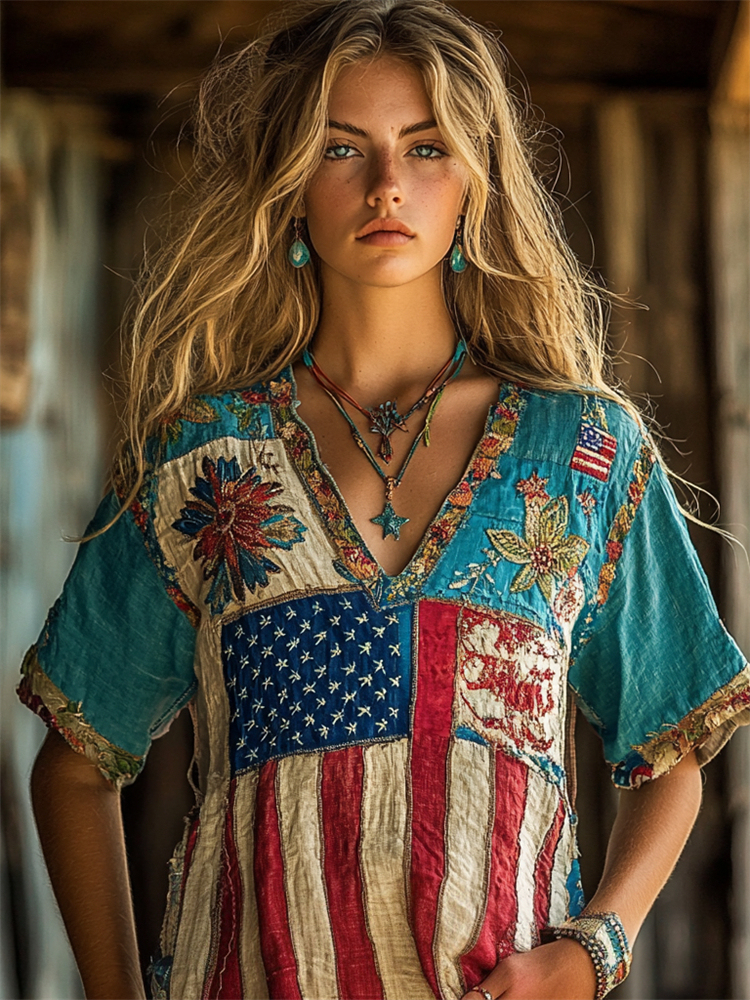 Boho Floral Embroidered American Flag Patchwork Linen Shirt