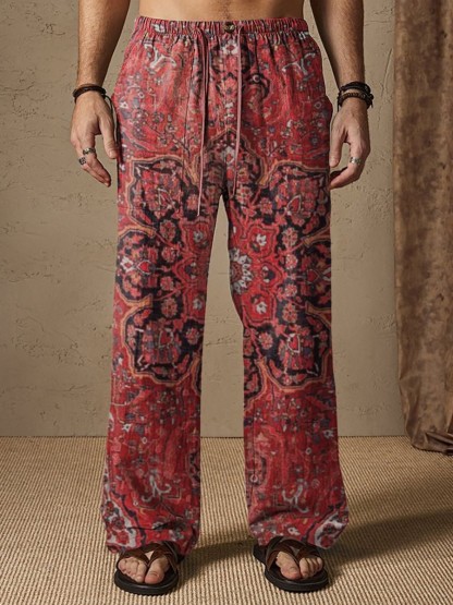 Men's Red Retro Ethnic Floral Pattern Comfy 100% Cotton Pants