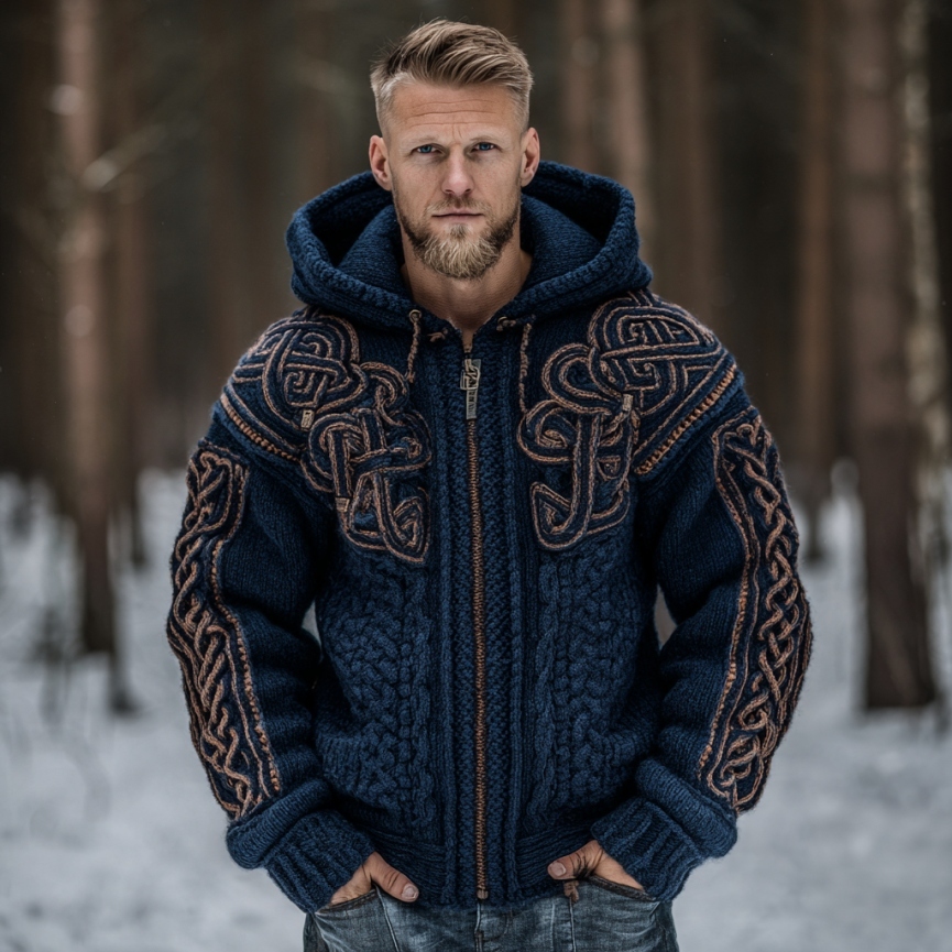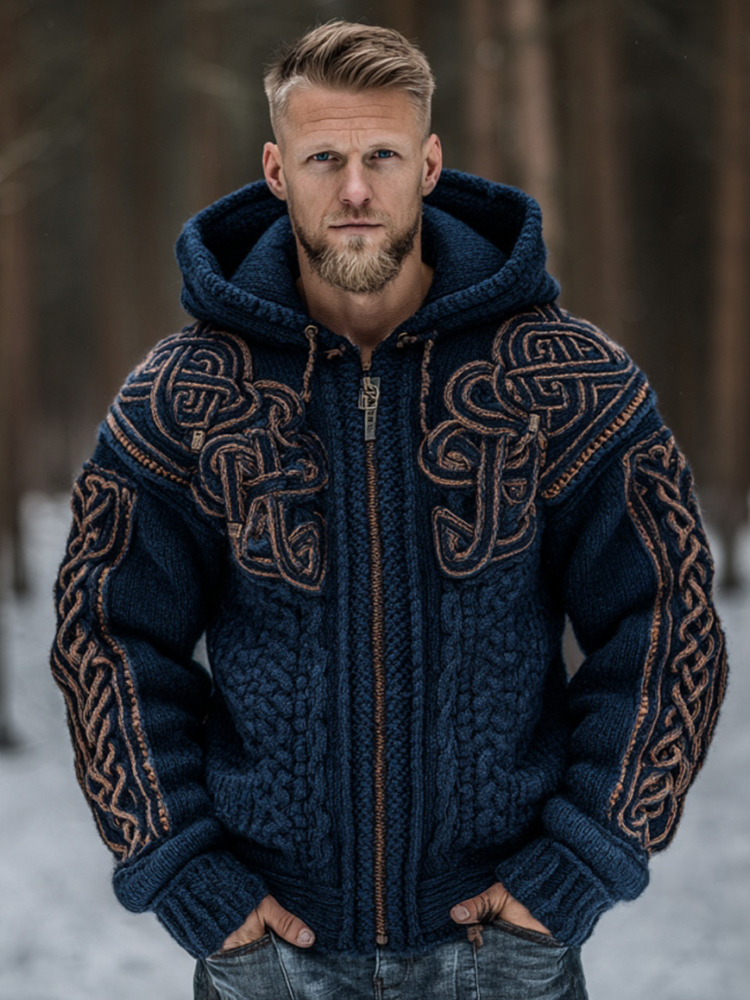 Men's Vintage Viking Celtic Knot Art Chunky Knit Hooded Zip-up Sweater