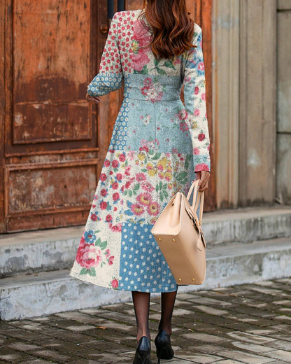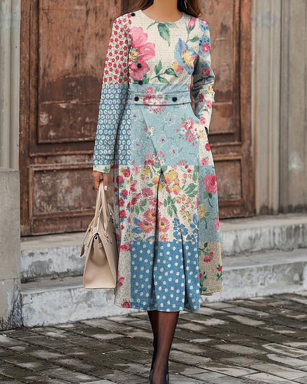 Vintage Bohemian Floral Print Round Neck Long Sleeve Dress