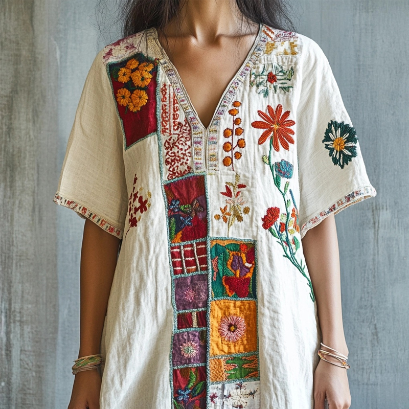 Vintage Boho Floral Embroidered V Neck Linen Shirt