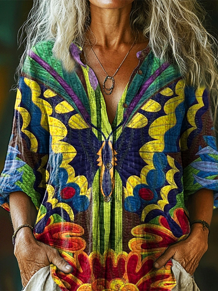 Women's Colorful Butterfly Texture Art Print Casual Cotton Linen Shirt