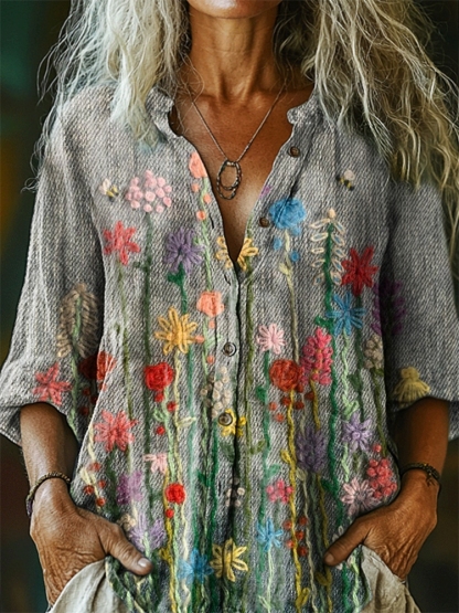 Women's Floral Pattern Art Print Casual Cotton Linen Shirt