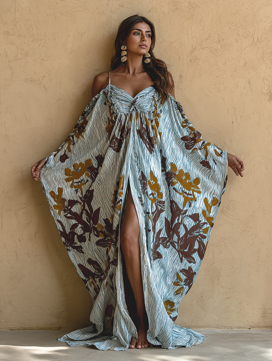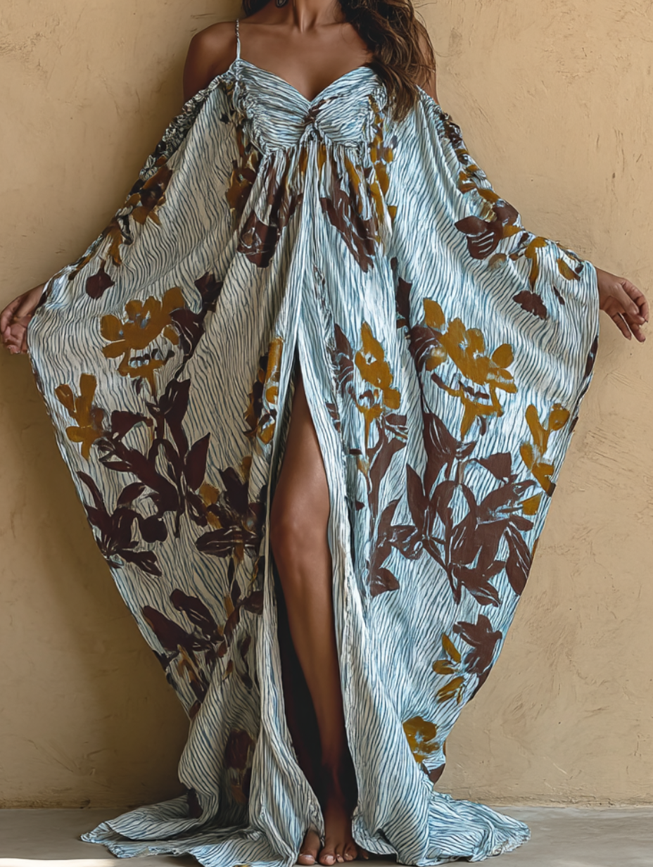 A distinctive teal background with a striped art print and a vest-shaped off-the-shoulder front and center slit adds a vibrant bohemian twist to your wardrobe.
