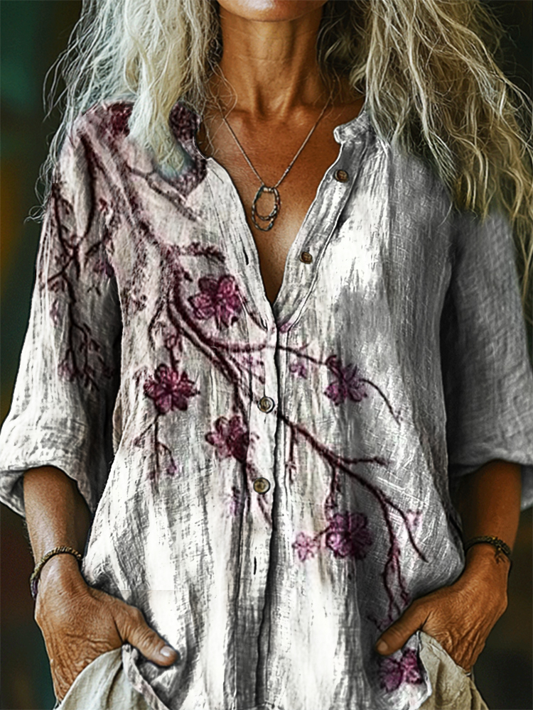 Women's Vintage Floral Art Print Casual Cotton Linen Shirt
