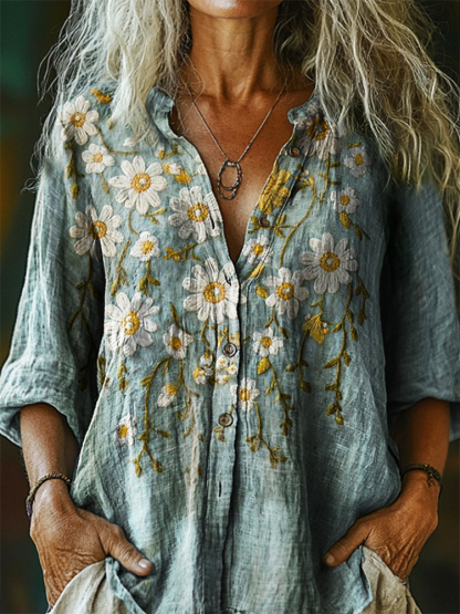 Women's Vintage Floral Art Print Casual Cotton Linen Shirt