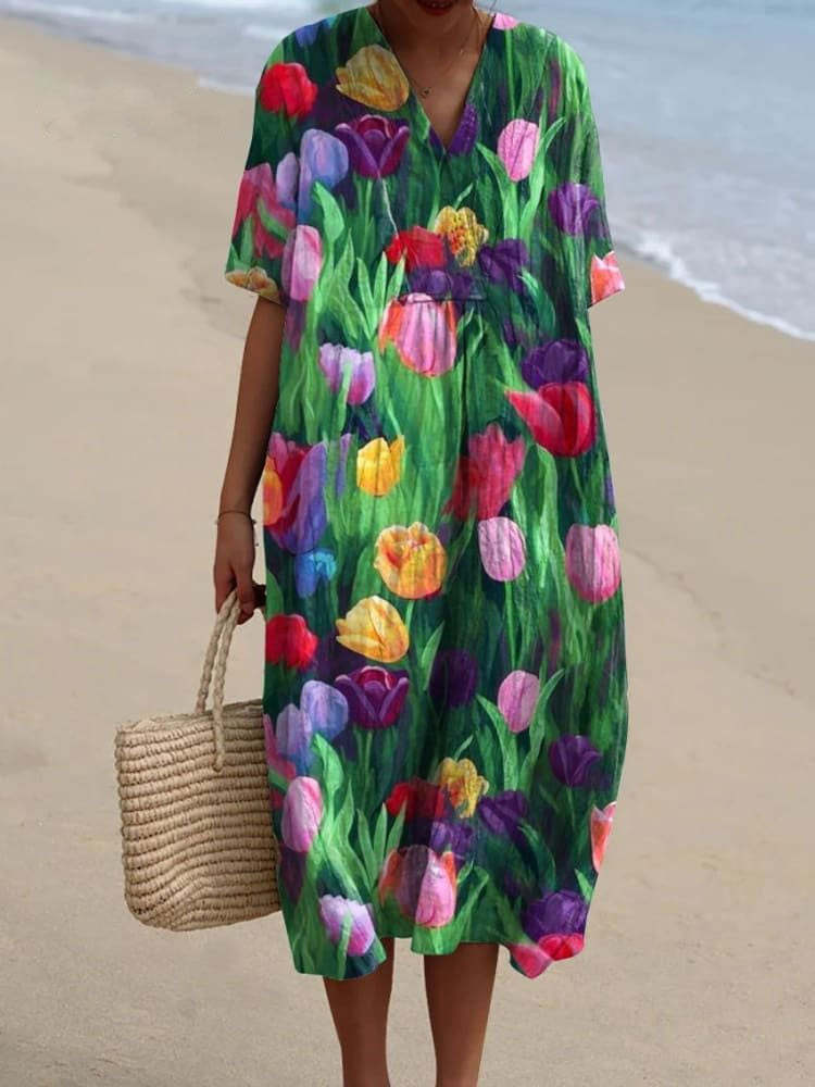 Women's Vintage Lovely Floral Art Print Flowy Dress