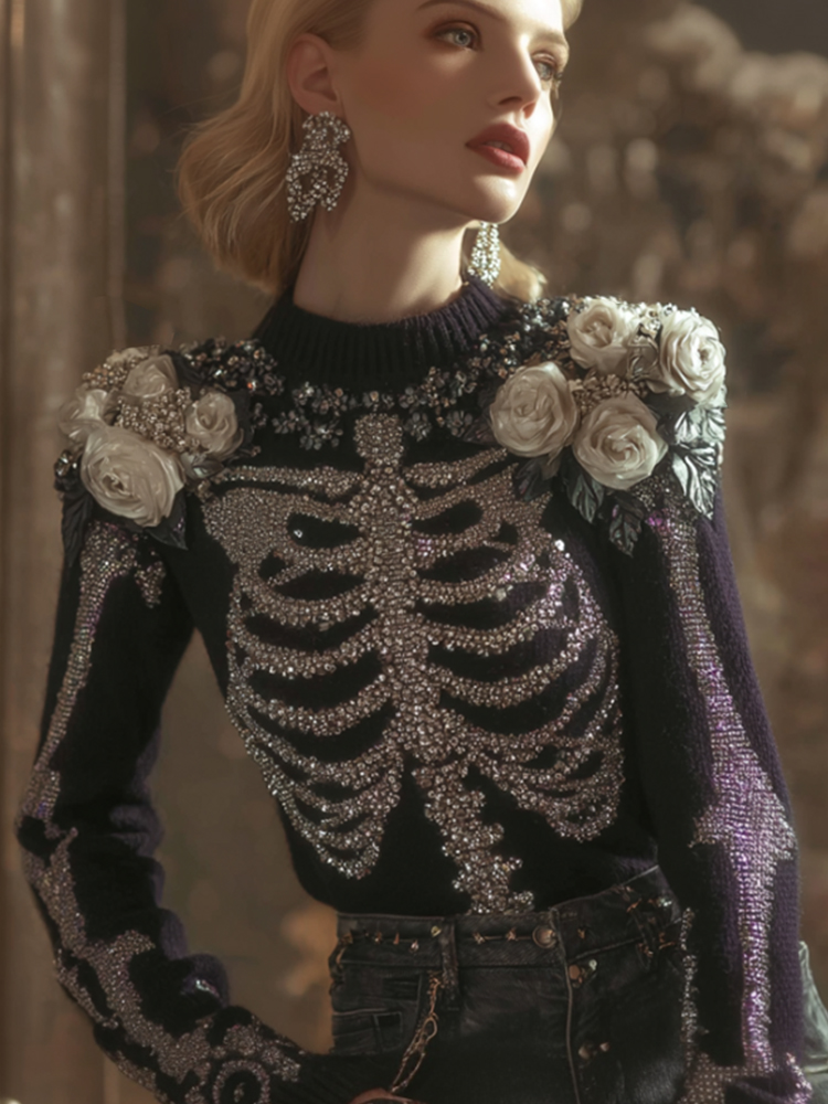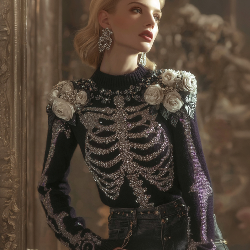 Halloween Anatomy Art Skeleton Flower Round Neck Sweater
