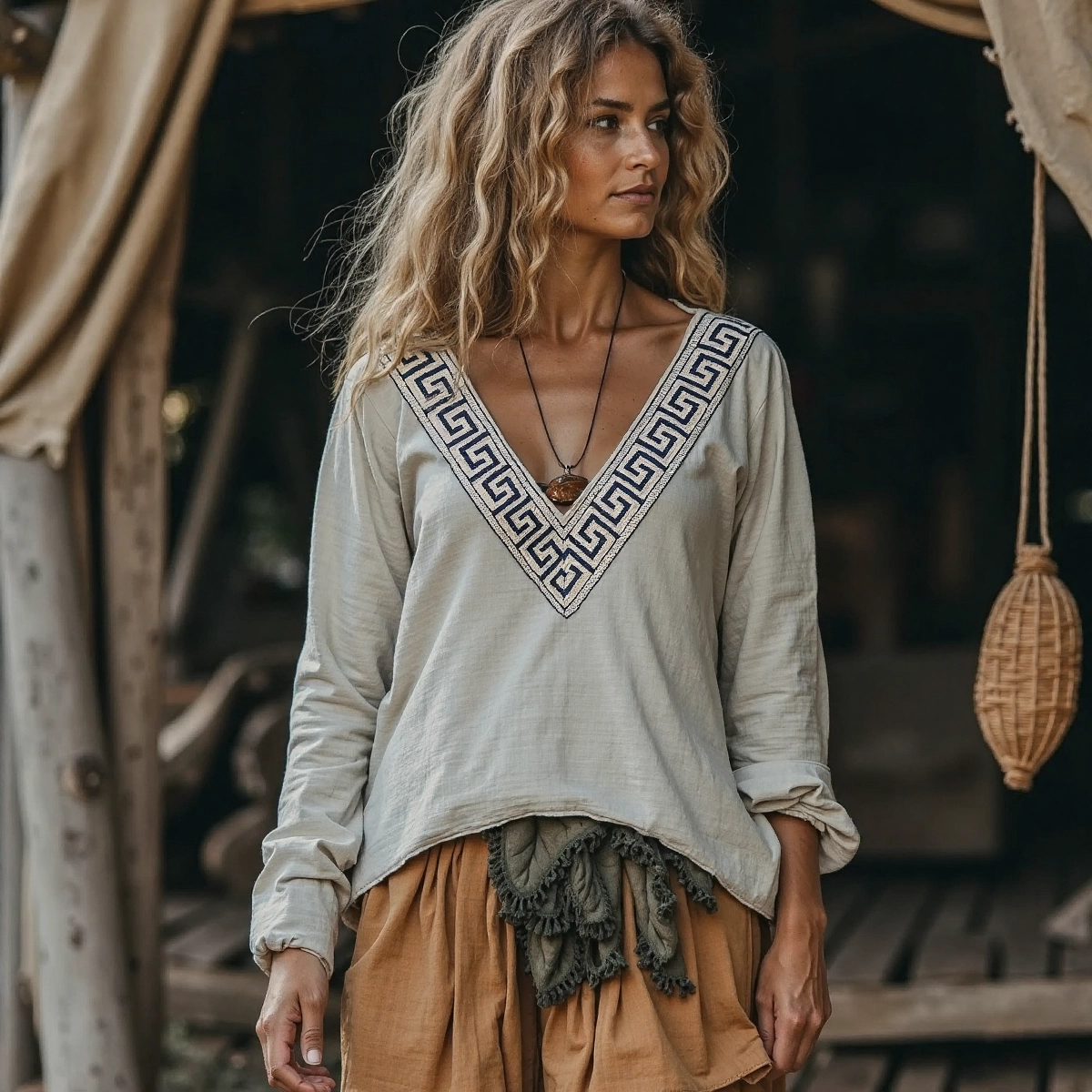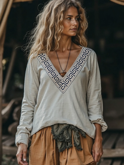 Vintage Greek Key Pattern V-neck Linen Blend T-shirt