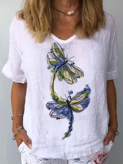 Women's Casual Cotton and Linen Dragonfly Print Top