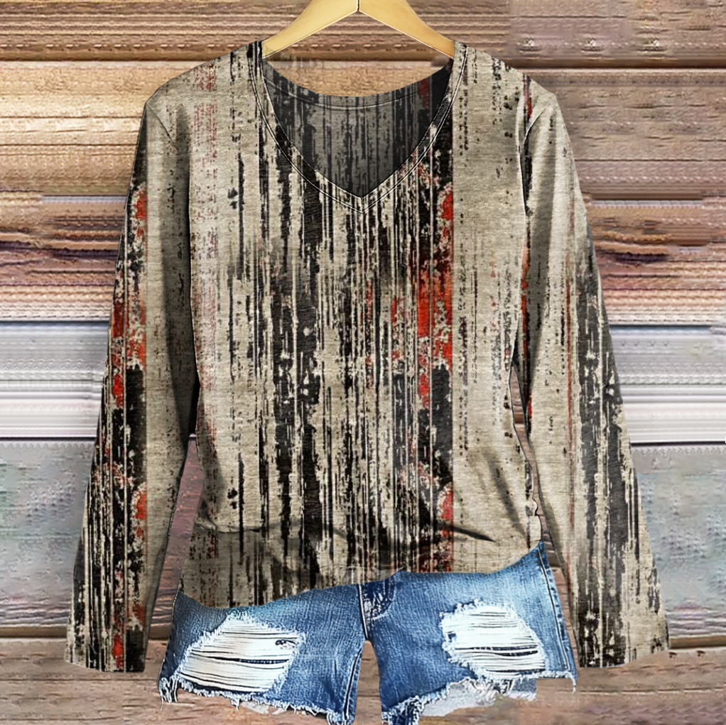 Women's Vintage Bohemian Art Print Casual V-neck Long Sleeve T-shirt