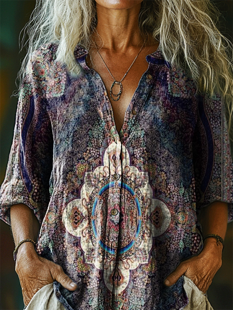 Women's Vintage Ethnic Floral Art Print Casual Cotton Linen Shirt