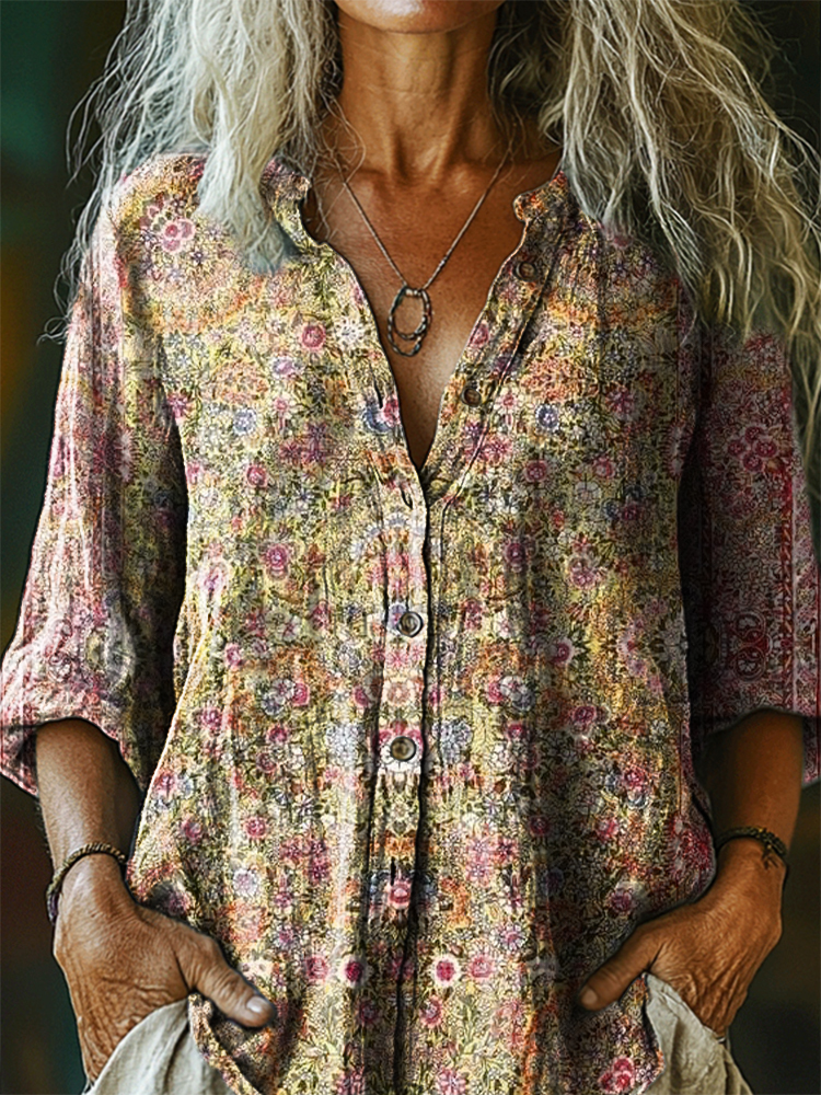Women's Vintage Ethnic Floral Art Print Casual Cotton Linen Shirt