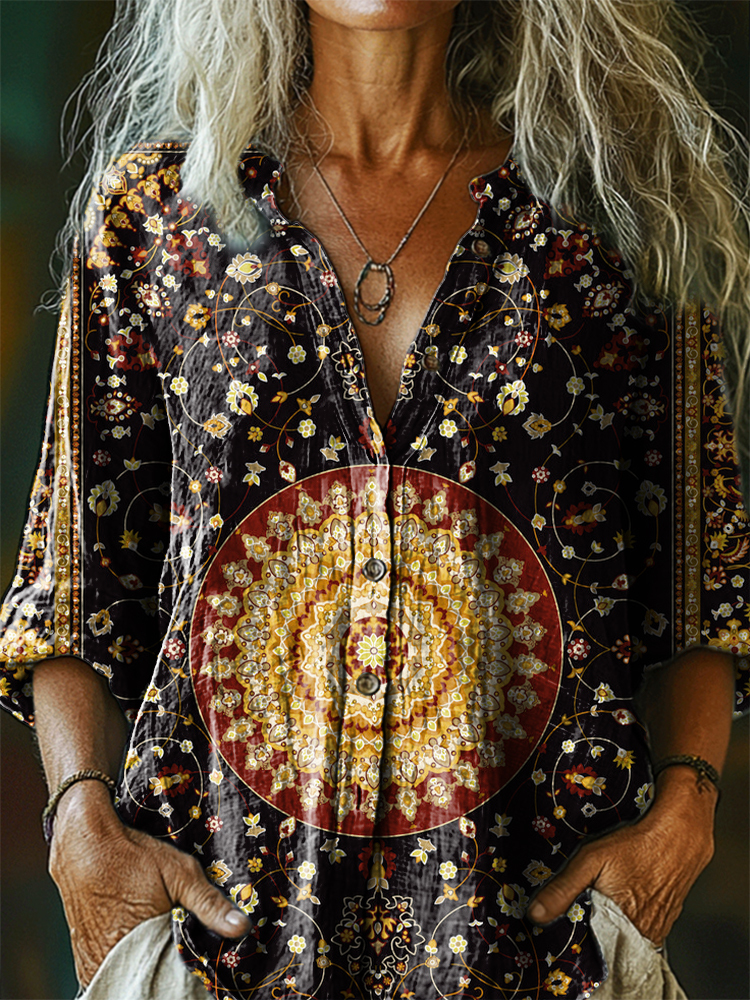 Women's Vintage Ethnic Floral Art Print Casual Cotton Linen Shirt