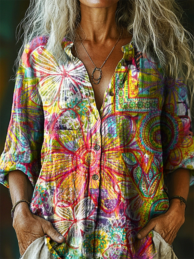 Women's Vintage Floral Art Print Casual Cotton Linen Shirt