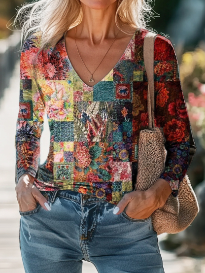 Women's Vintage Floral Art Print Casual V-neck Long Sleeve T-shirt