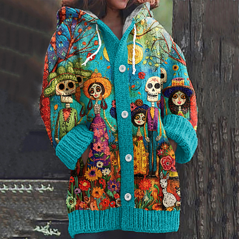 Vintage Mexican Day Of The Dead Skull Knit Cardigan Sweater