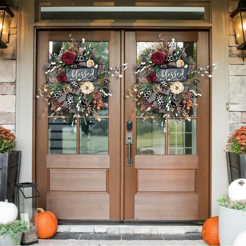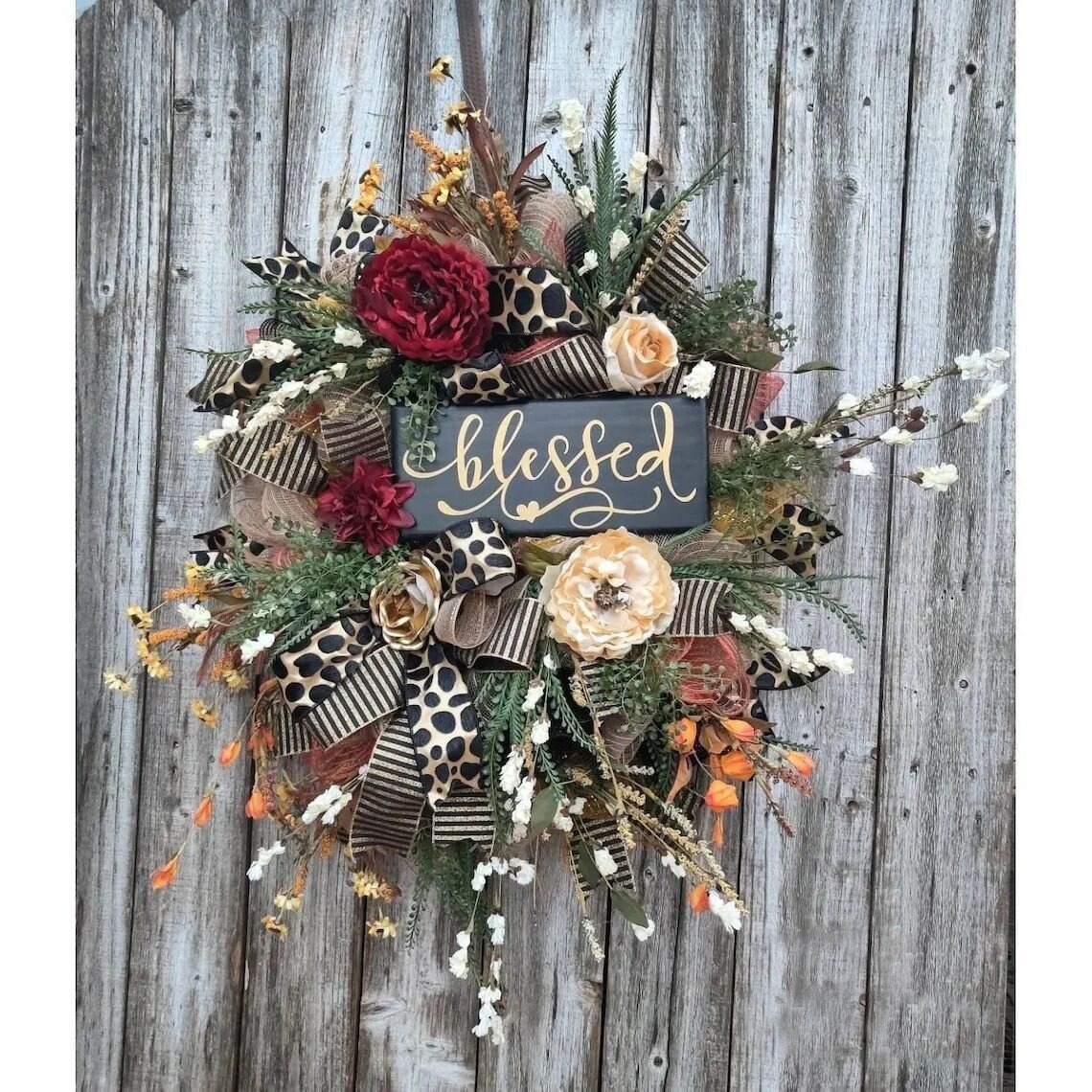 Unique charm:🌺This is an elegant traditional wreath, perfect for the entire season. The sign is custom-made by a talented artisan.It has beautiful foliage nestled in the hydrangeas and lovely deep red florals.🍂🍁Double bows in gold and black. Cheetah is a plus.