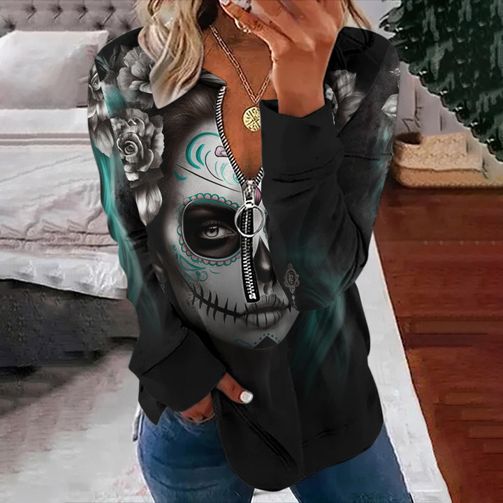 Day Of The Dead Printed V-Neck Zipper Sweatshirt