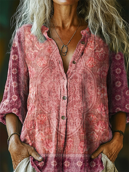 Ethnic Style Floral Pattern Art Print Cotton Linen Casual Women's Shirt