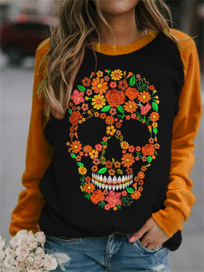Floral Sugar Skull Contrast Color Sweatshirt