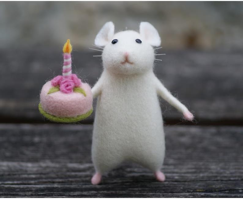 This little mouse is so cute and joyful. He holds a cake with a candle in his paw.
