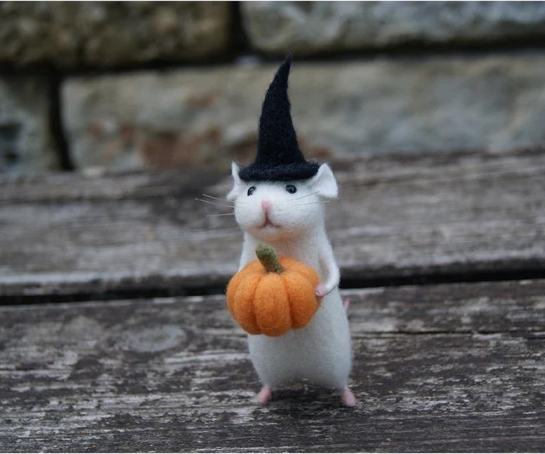 Needle felted Halloween mouse with black Halloween hat holding a pumpkin. The pumpkin is movable.