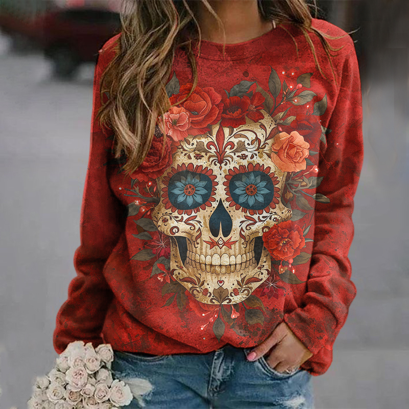 Mexican Day Of The Dead Skull Print Crew Neck Sweatshirt