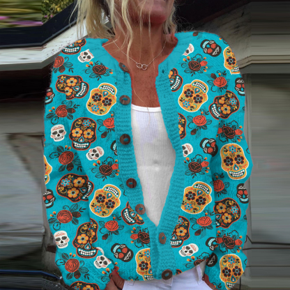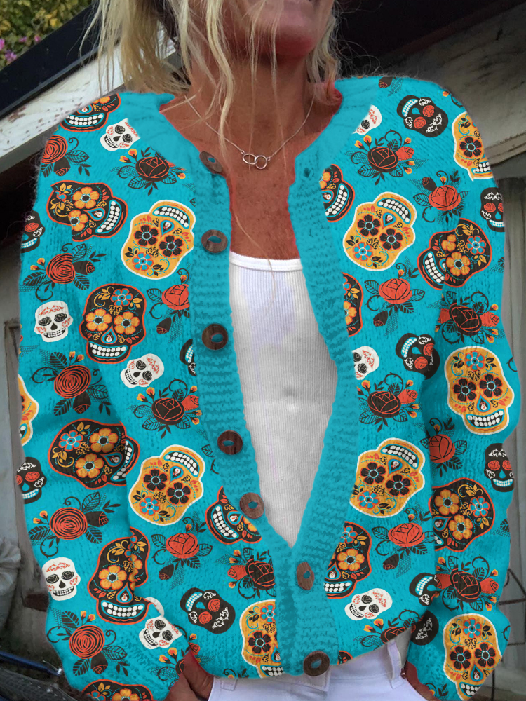 Mexican Day Of The Dead Skull Print Knit Cardigan