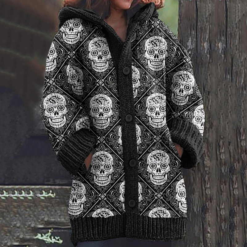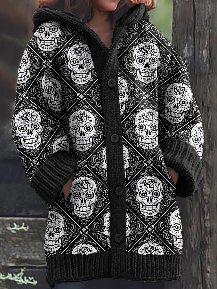 Mexican Skull Floral Art Knitted Warm Sweater Cardigan