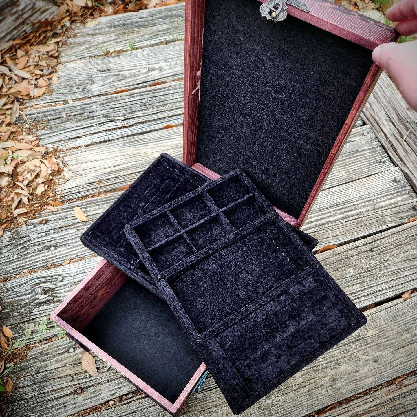 Crafted from high-quality pine wood, the Skull and Nature Hidden Key Box ensures durability and longevity. Woodburned, stained, and hand painted with acrylic, gouache and metallic paint. Everything has a clear protective top coat to seal the wood and paint. The interior compartments are lined with velvet and black felt to protect delicate jewelry items from scratches and damage. With ample space for rings, earrings, necklaces, and other small treasures, this key box organizes valuables while maintaining an air of intrigue and sophistication.