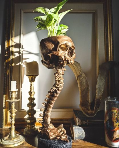 Made in high quality heat resistant resin, they will never warp while plants are sunbathing. An interlocking system allows the skull planter to sit comfortably and securely on the spine stand.Psst! Cats are no match for the sturdy cement base.