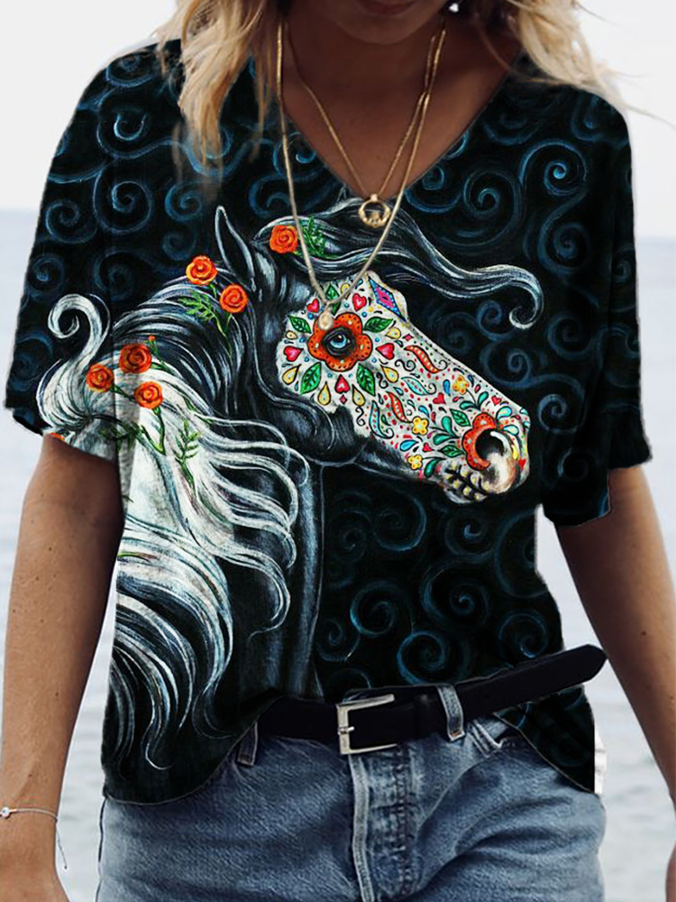 Sugar Skull Inspired Horse Art V Neck T Shirt