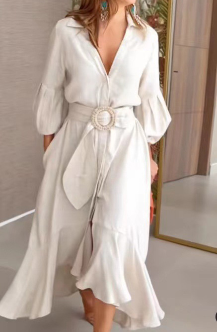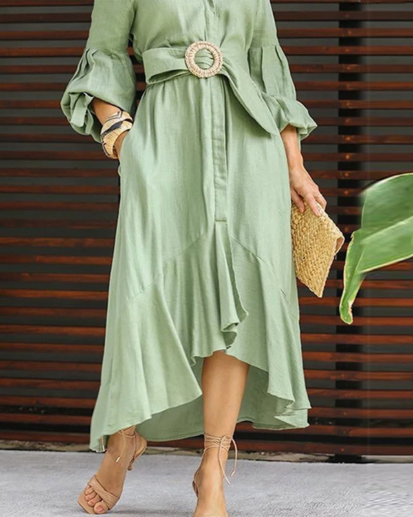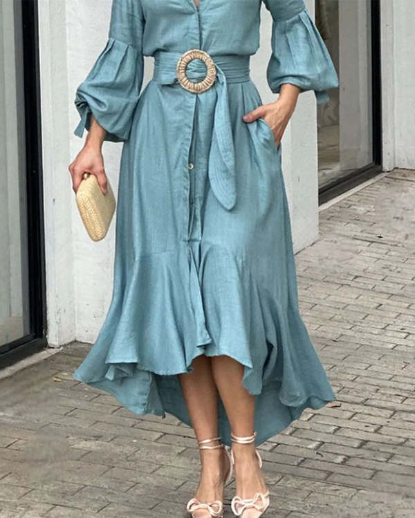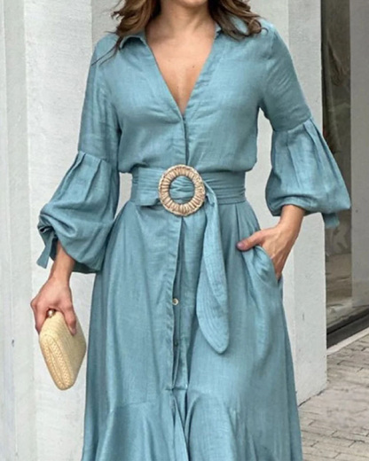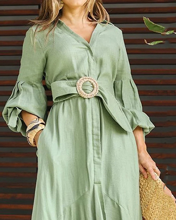 Temperament Casual V-neck Collar Solid Color Pocket Dress