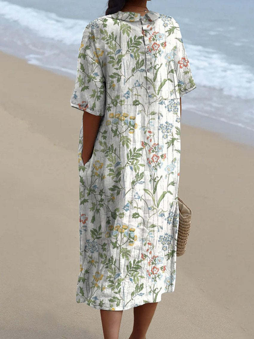 Tranquil Spring Field Pattern Printed Women's Pocket Linen Dress (Convertible Dress With Front And Back Option)